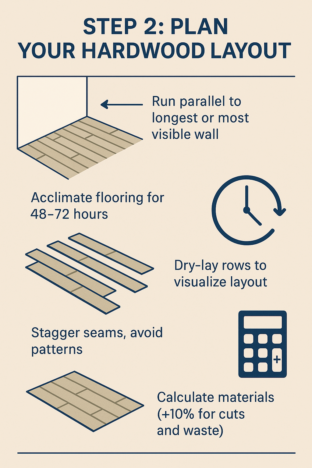 In most rooms, it’s good to have hardwood planks go parallel to the longest or most visible wall—this helps the room look bigger. If doing multiple rooms, think about how planks will line up through doorways.